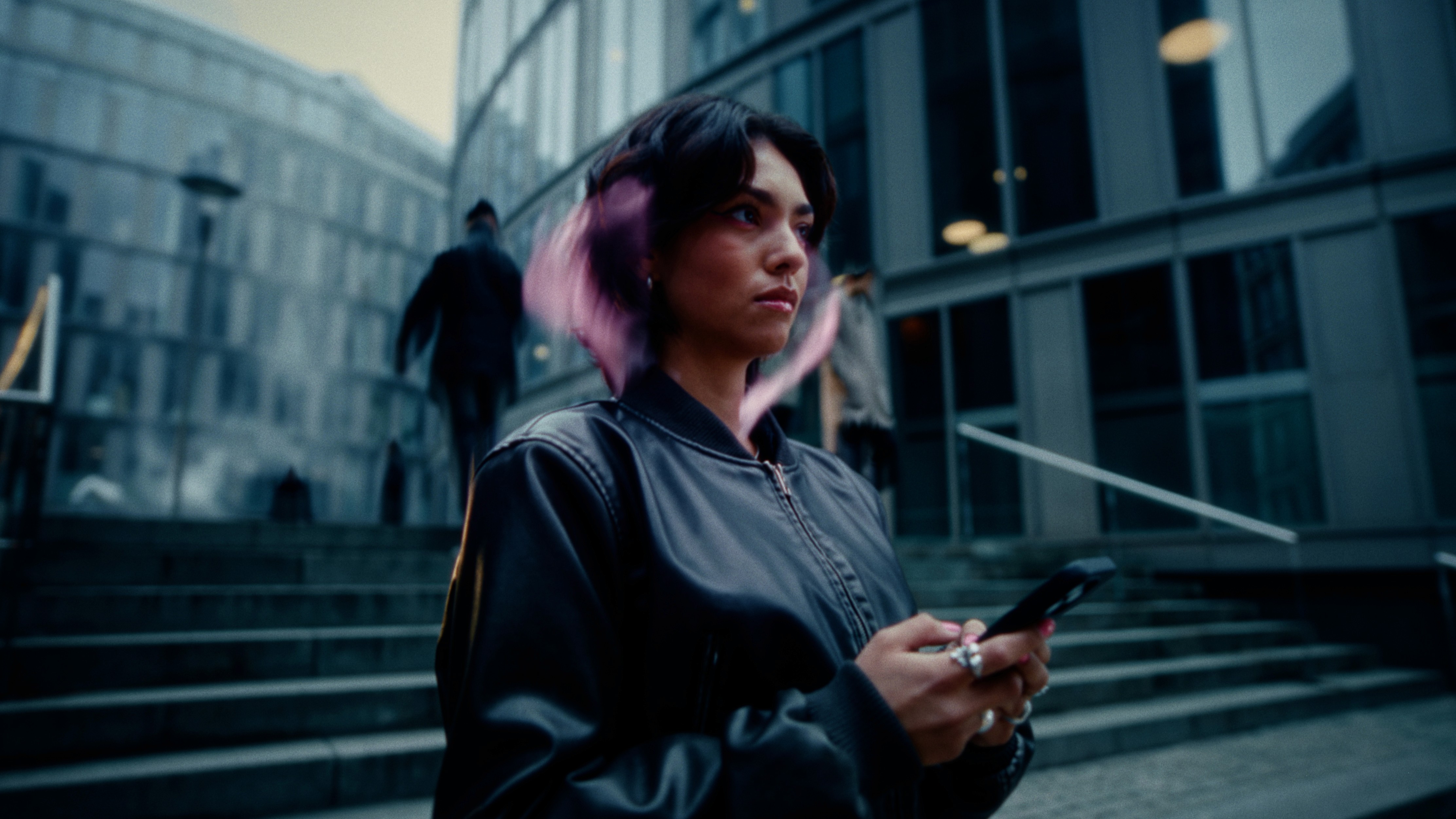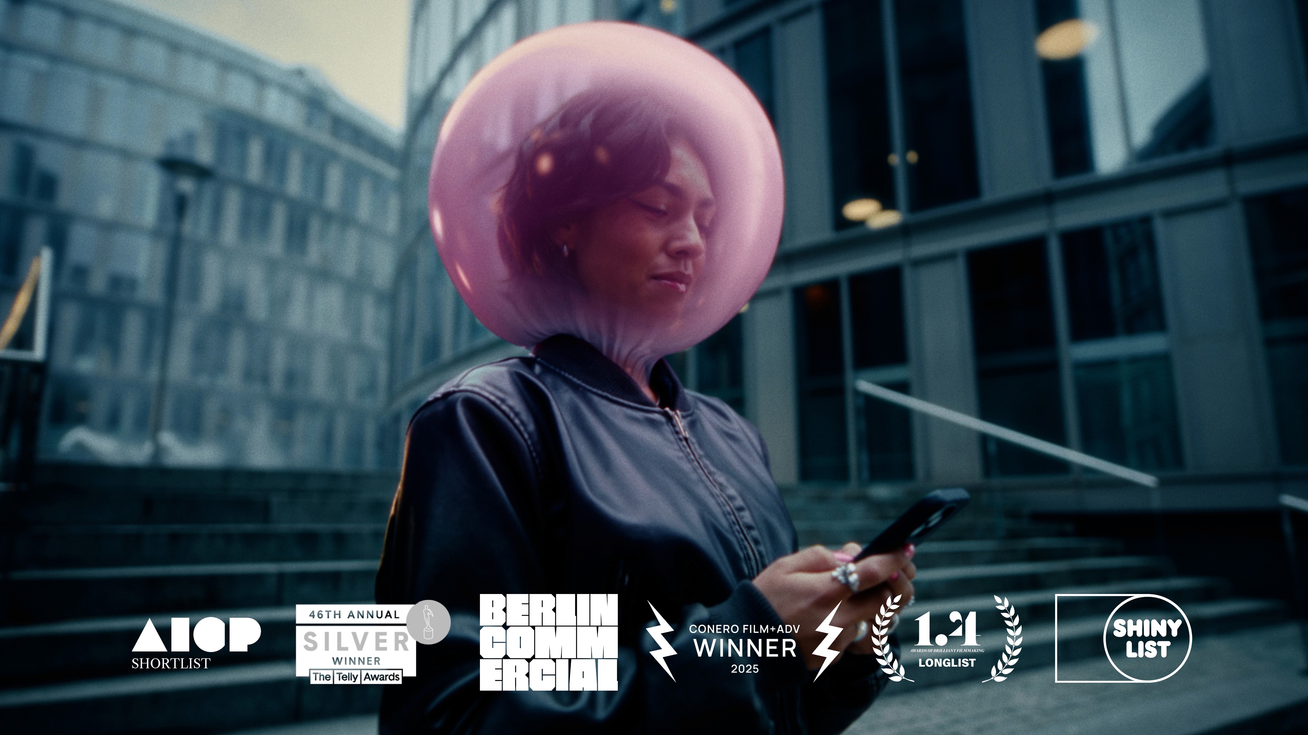 In a modern high-rise setting, gum-chewing Riley is absorbed in her smartphone. A pink bubble floats around her head, symbolizing her own world. Until a voiceover unexpectedly reveals that all chewing gums contain plastic – and Riley’s carefree world literally bursts apart in the same moment.